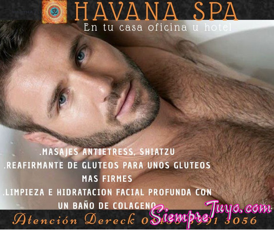 SERVICIOS EXCLUSIVOS PARA CABALLEROS UN CONCEPTO DE VANGUARDIA EN "CDMX PENSADO PARA EL HOMBRE DE HOY QUE DESEA UNA IMAGEN IMPECABLE DISFRUTA DE NUESTRA CARTERA DE MASAJES A DOS O CUATRO MANOS ( RELAJANTE , ANTIESTRESSS , SHIATZU , EN CICLOS , DESCONTRACTURANTE Y NUESTRO FAMOSO "TANTRICO PROFUNDO" ) , RECORTE DE VELLO CORPORAL Y GENITAL PARA DESTACAR TUS MEJORES ATRIBUTOS PARA UNA APARIENCIA MAS PULCRA , FRESCA Y SEXY !!! , LIMPIEZA E HIDRATACION FACIAL PROFUNDA CON UN BAÑO DE COLAGENO PURO ACTIVADO CON LASER , D-TOX FACIAL CON MASCARILLA DE CARBON ACTIVADO Y REJUVENECIMIENTO FACIAL CON MASCARILLA DE ORO O BAÑO DE COLAGENO PURO , REFLEXOLOGIA PODAL CON ENVOLTURA DE CITRICOS , MUSICOTERAPIA , AROMATERAPIA Y REYKI PARA UNA ATMOSFERA , CALIDA , INTIMA Y RELAJADA . PARA CONCERTAR CITAS AL CEL Y WHATSSAPP : 55 59 91 30 56. O VISITA NUESTRA PAGINA *** havana-men-spa.com *** PARA TU COMODIDAD ACEPTAMOS TARJETAS DE CREDITO ***SERVICIO PROFESIONAL Y DISCRETO EN EL HOTEL DE TU PREFERENCIA O EN LA COMODIDAD DE TU DOMICILIO , DONDE TU LO NECESITES *** ATENCION PERSONAL " DERECK BAWER". ACEPTAMOS TARJETAS DE CREDITO , DEBITO O TRANSFERENCIA BANCARIA , DOLLARES Y EUROS.